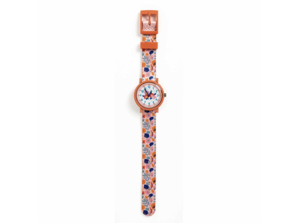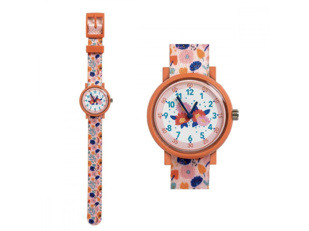Djeco Náramkové ručičkové hodinky Květy s hravým elegantním designem, ilustracemi květin a přehledným ciferníkem (vyznačené hodiny a minuty). Mají neslyšný mechanismus, jsou nárazuvzdorné a vlhkotěsné (3 bar). Řemínek je z polyesteru, přezka z pevného plastu.