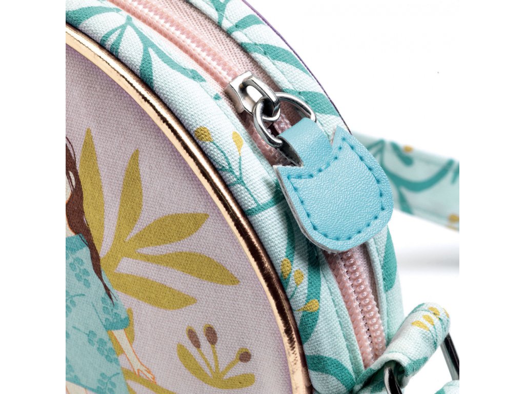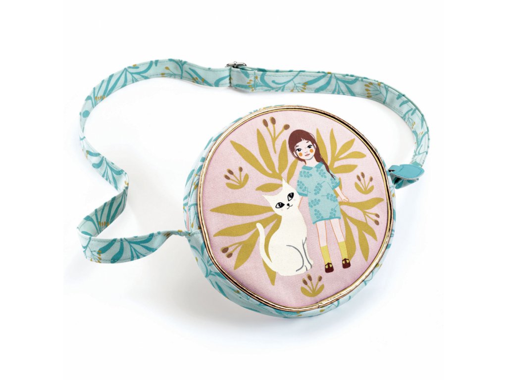 Djeco Kočka je kruhová kabelka s potiskem. Hlavní motiv kočky a dívky na přední straně je zvýrazněn lesklým lemem. Zavírání na zip. Délka ramenního popruhu je nastavitelná. Materiál: 100% bavlna (líce), 10% bavlna + 90% polyester (rub).